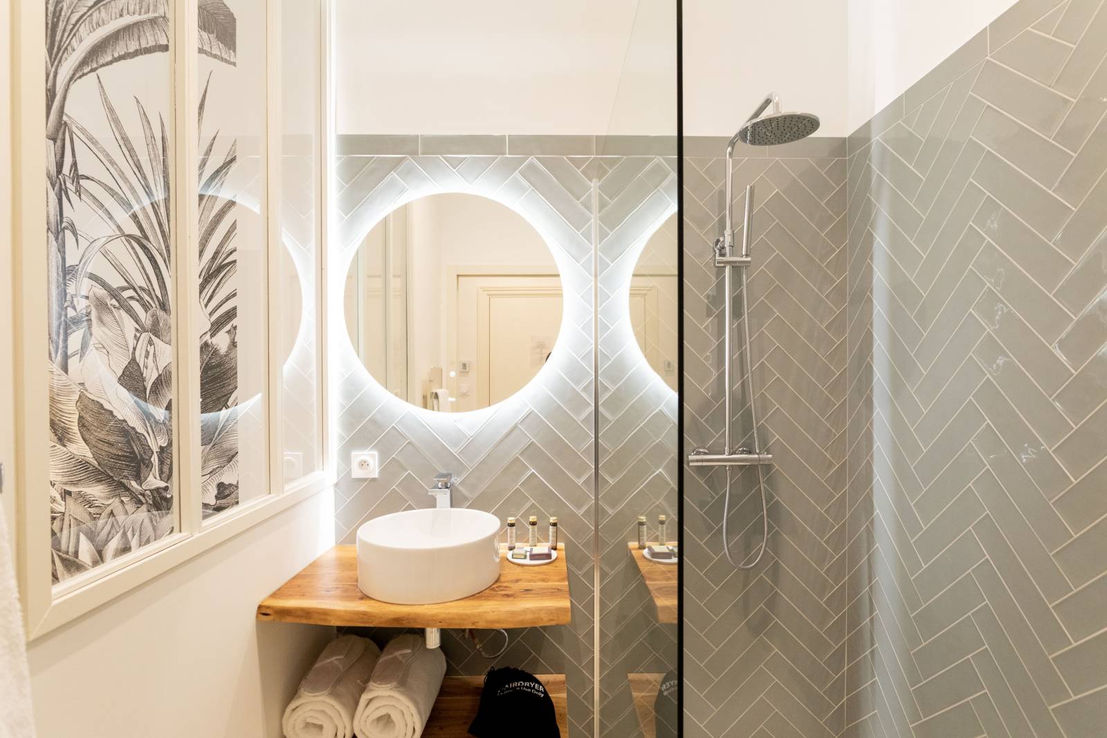 La salle de bains est ouverte sur le reste de la chambre par une verrière, composée d’une douche spacieuse et de produits de toilette naturels, pour une expérience de bien-être complète. Des serviettes moelleuses sont mis à votre disposition.